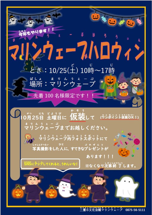 内容 | 毎年恒例のマリンウェーブ・ハロウィンイベント。今年は10月25日に開催します。 仮装して、マリンウェーブに集まれ! ハロウィンフォトスポットで写真を撮ってくれたおともだちに、素敵なプレゼントを用意してます。 (対象:小学6年生まで) みんな気を付けてマリンウェーブに遊びにきてね。 |