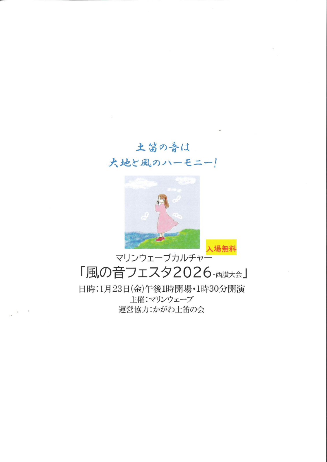 1月23日(金) 「風の音フェスタ2026年・西讃大会」 開催日 2026年1月23日(金) 時刻 開場13:00 開演13:30 会場 三豊市文化会館マリンウェーブ マーガレットホール 出演者 内容 大地と風のハーモニーをマーガレットで! 入場無料ですので、ぜひお越しください。 座席 全席自由席 料金 入場料無料 チケット 販売無し プレイガイド 更新日:2026年1月22日 1月24日(土) 映画「みとよ物語」 2月7日(土) 【映画】35年目のラブ...