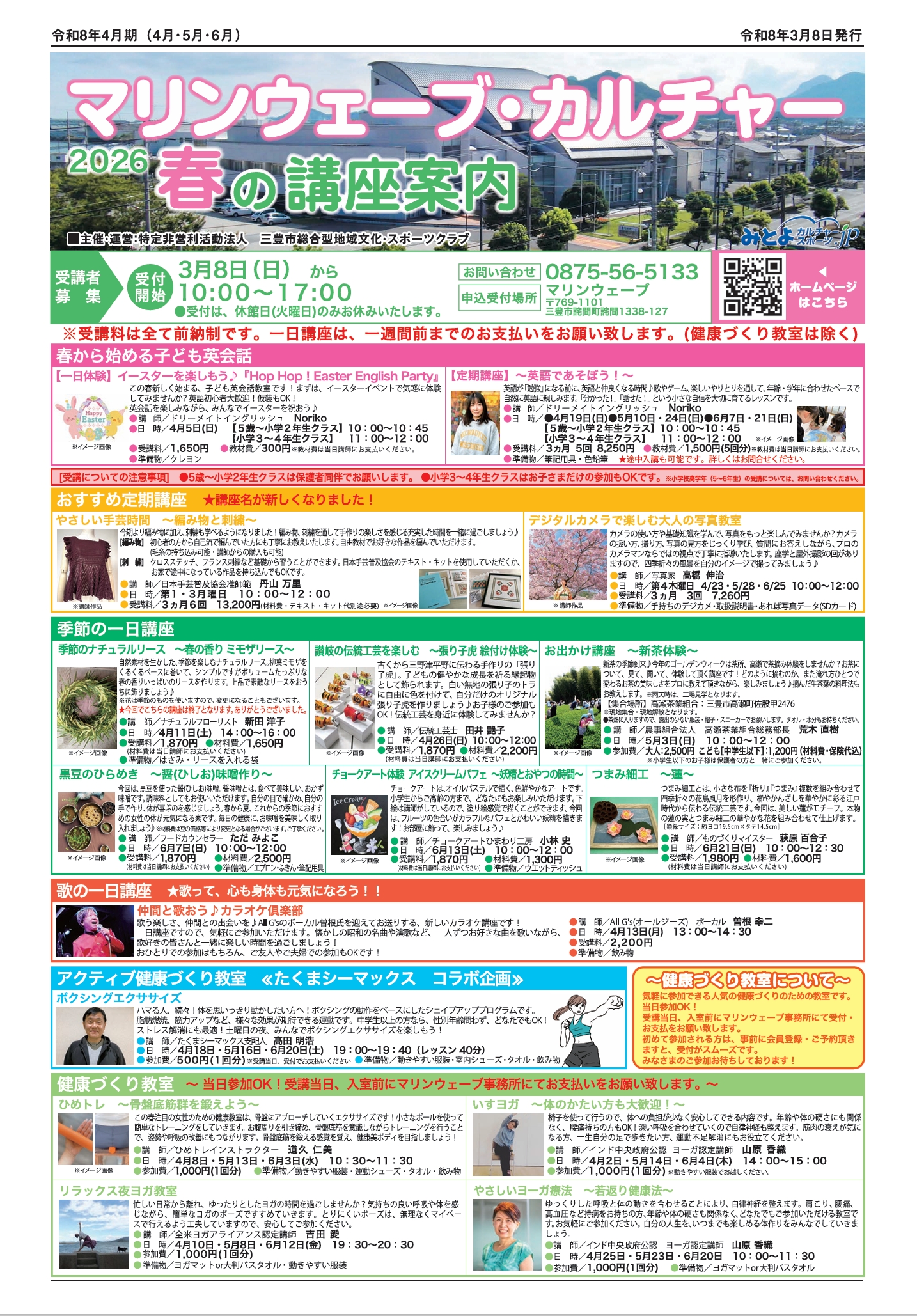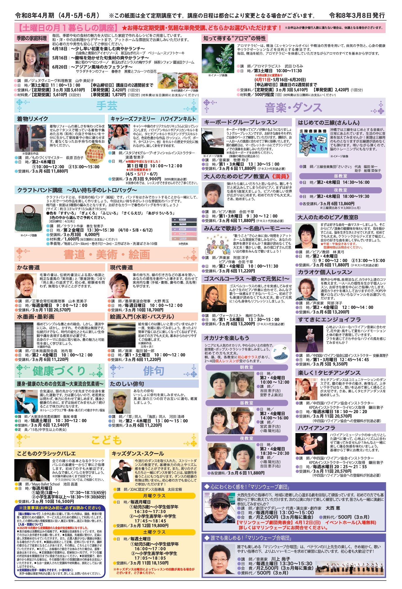 【受付開始!】マリンウェーブ・カルチャー 2026年春の講座案内 カルチャーマリンウェーブ この春、マリンウェーブカルチャーで新しいこと始めませんか? じっくり学ぶ定期講座、気軽に楽しめる1日講座や人気の健康講座もございます。 お気軽にお問い合わせください。 ご参加お待ちしております!! 詳細はこちら 更新日:2026年3月8日 【Jrスイミングスクール】春のスク...