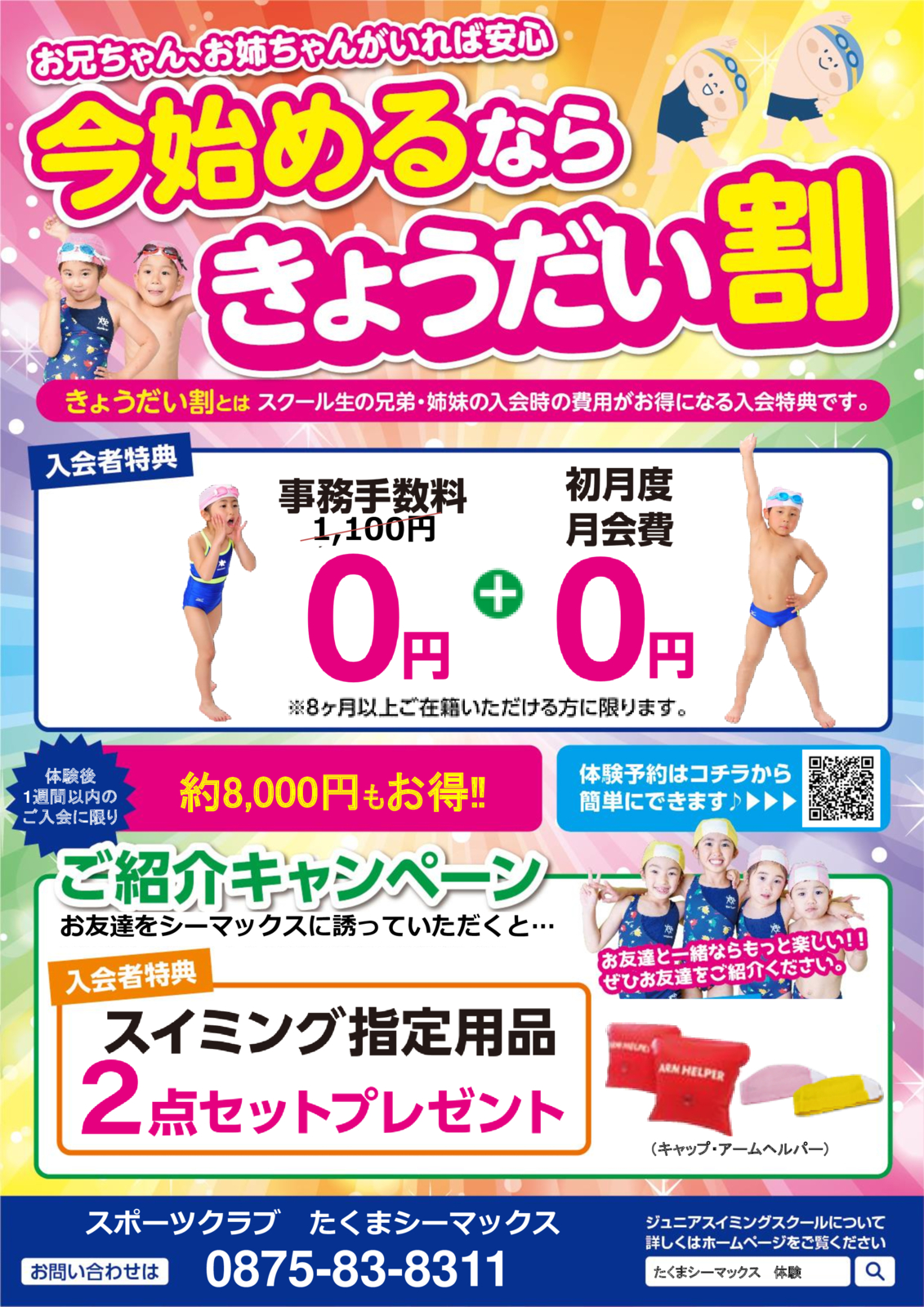 【Jrスイミングスクール】きょうだい割のご案内 PDFでダウンロード シーマックス 紹介での入会がお得!?ご兄弟、お友達の紹介で お得にプールを始めることができます! 詳細はこちら 更新日:2026年2月19日 【Jrスイミングスクール】春のスク... 2月23日(月・祝)天皇誕生日プログラム