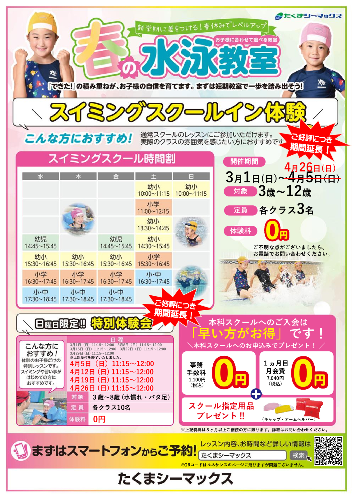 【ご好評につき期間延長!】春のスクールイン体験会・日曜特別体験会のご案内 PDFでダウンロード シーマックス 新学期に差をつける!春から新しい習い事をはじめませんか? 今なら体験料0円!体験1週間以内のご入会で超おトクな特典が付きます! 詳細はこちら 更新日:2026年4月3日 5月4日(月・祝) みどりの日プログラム