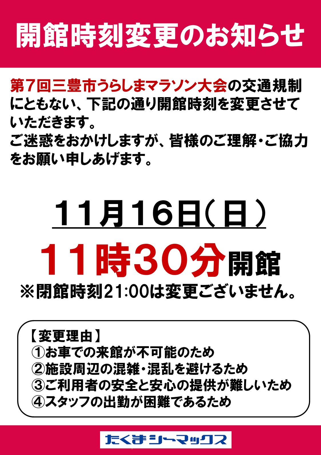 11月16日(日)開館時間変更のお知らせ シーマックス 11月16日(日)開館時間変更のお知らせ うらしまマラソン 詳細はこちら 更新日:2025年10月17日 マリンウェーブより開館時刻変更の... ジュニアダンスカレンダー10月~11月