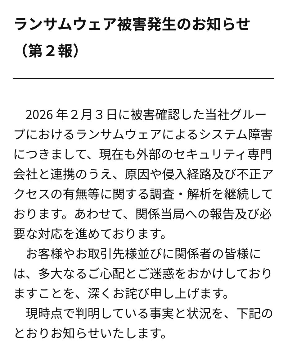 2026 年2月3日に被害確認した当社グループにおけるランサムウェアによるシステム障害につきまして、現在も外部のセキュリティ専門会社と連携のうえ、原因や侵入経路及び不正アクセスの有無等に関する調査・解析を継続しております。あわせて、関係当局への報告及び必要な対応を進めております。