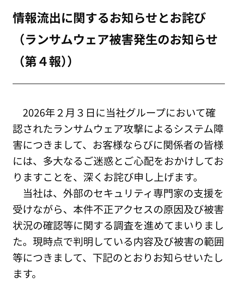 2026年2月3日に当社グループにおいて確認されたランサムウェア攻撃によるシステム障害につきまして、お客様ならびに関係者の皆様には、多大なるご迷惑とご心配をおかけしておりますことを、深くお詫び申し上げます。