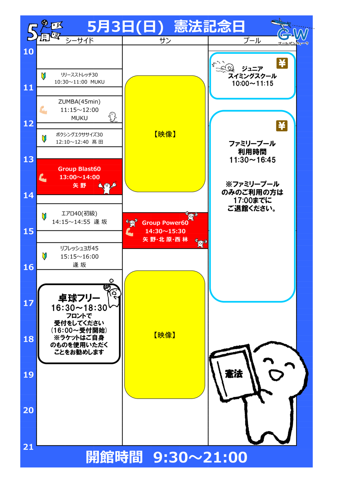 5月3日(月・祝) 憲法記念日プログラム PDFでダウンロード シーマックス 5月3日(月・祝) 憲法記念日プログラム 詳細はこちら 更新日:2026年4月3日 5月4日(月・祝) みどりの日プログラム 志々島へ渡航される皆さまへ