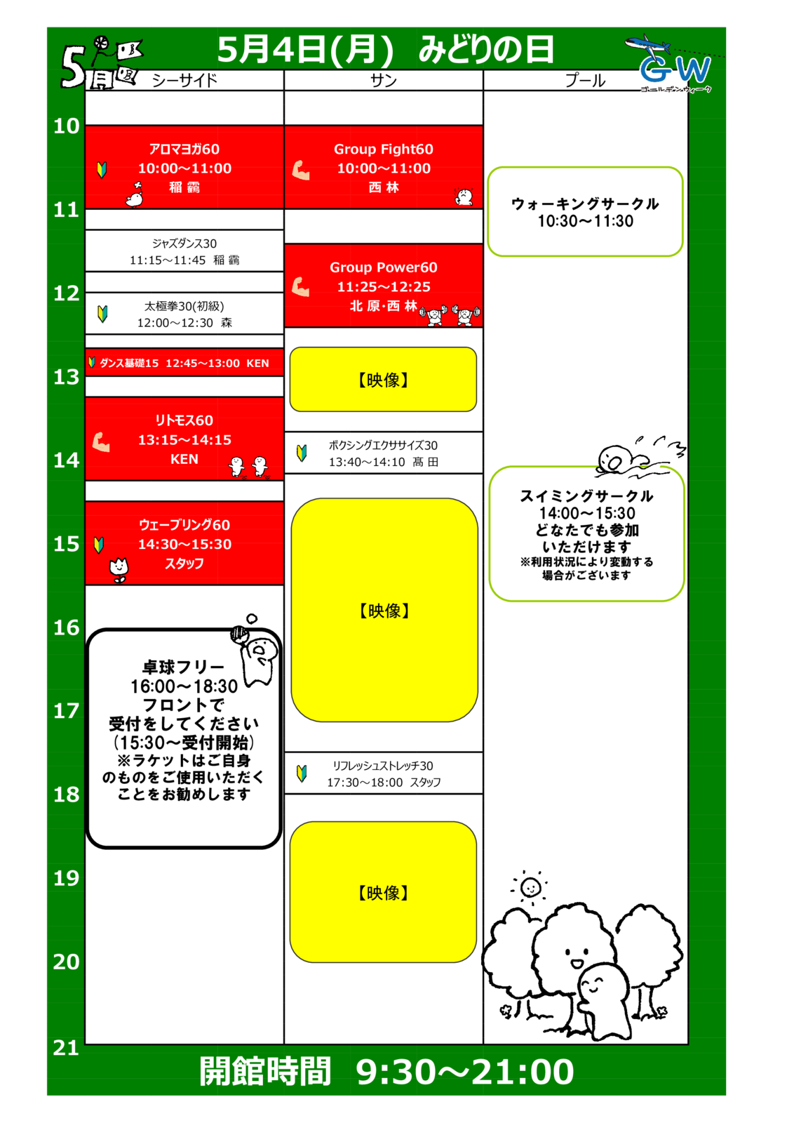 5月4日(月・祝) みどりの日プログラム PDFでダウンロード シーマックス 5月4日(月・祝) みどりの日プログラム 詳細はこちら 更新日:2026年4月3日 【ご好評につき期間延長!】春のス... 5月3日(月・祝) 憲法記念日プログラム